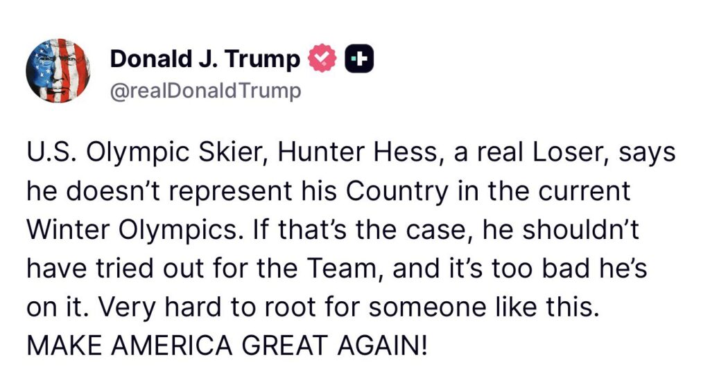 “Hunter Hess, un auténtico perdedor, dice que no representa a su país en los actuales Juegos Olímpicos de Invierno”.