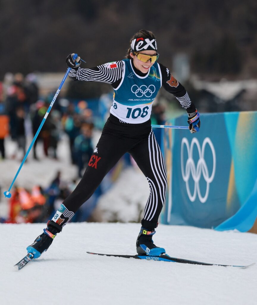 Unos minutos más tarde, Regina Martínez tuvo participación en la prueba de esquí de fondo y también lució este uniforme conmemorativo a 58 años de la justa olímpica mexicana.