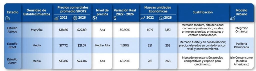 Spot2 dijo que “los estadios mundialistas funcionan como nodos de consumo urbano, no solo deportivos”, por lo que los entornos con base comercial previa sólida capturarán mejor el legado del Mundial.