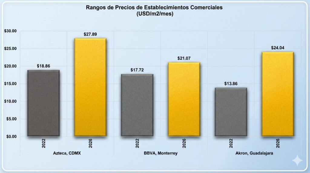 Lo anterior permitió que los precios promedio comerciales pasaran de 17.72 dólares por m² en 2022 a 21.07 dólares por m² en 2026, reflejando incrementos de 12% y una fase clara de consolidación.