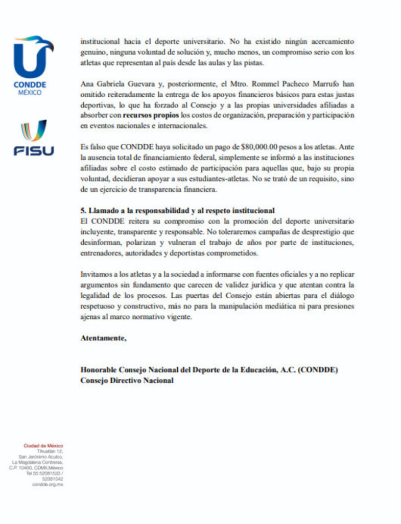 En ese mismo documento, el CONDDE negó haber pedido un pago de 80 mil pesos para poder ir a la Universiada Mundial 2025.