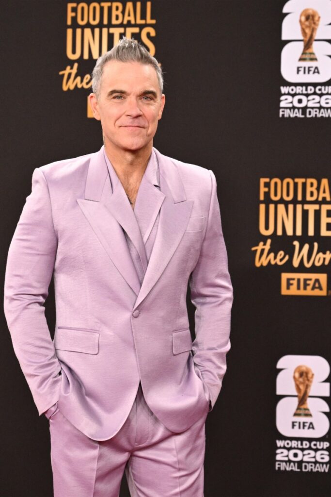 Robbie Williams, cantante británico, asistió a la alfombra roja del sorteo para el Mundial 2026 con un conjunto de color rosa. Al autor de éxitos como “Angel” se le vio sonriente, tomándose fotos desde la capital estadounidense.