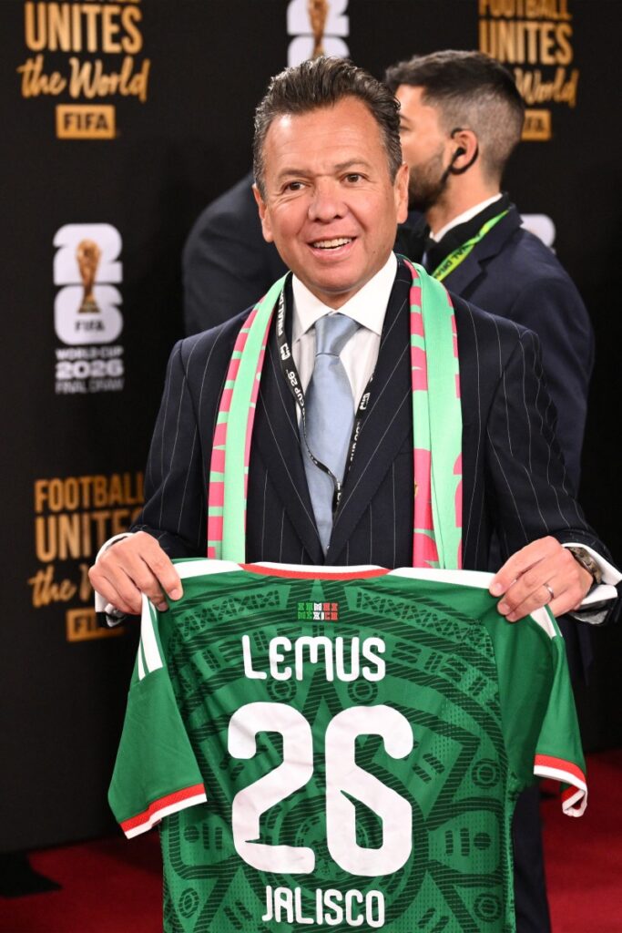Para completar la tercia de gobernadores de los estados sede del Mundial en México, el mandatario jalisciense, Pablo Lemus, posó en la alfombra roja del sorteo con un jersey conmemorativo del Tricolor.