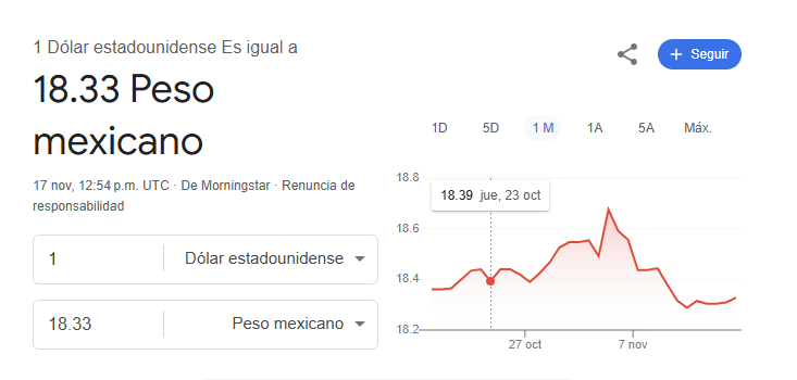 El precio del dólar este lunes 17 de noviembre de 2025 se cotizó en 18.33 pesos, de acuerdo con el tipo de cambio publicado por Google, ya que al ser día feriado el Diario Oficial de la Federación (DOF) no publica el tipo de cambio.