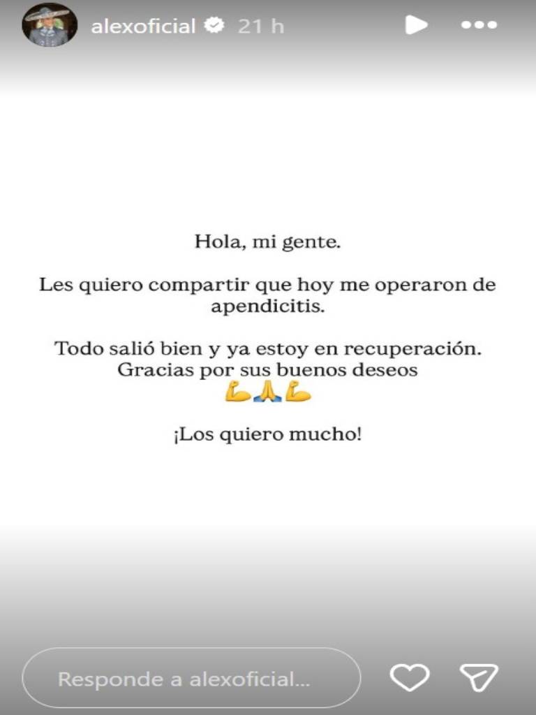 “Hola, mi gente. Les quiero compartir que hoy me operaron de apendicitis. Todo salió bien y ya estoy en recuperación. Gracias por sus buenos deseos. ¡Los quiero mucho!”.