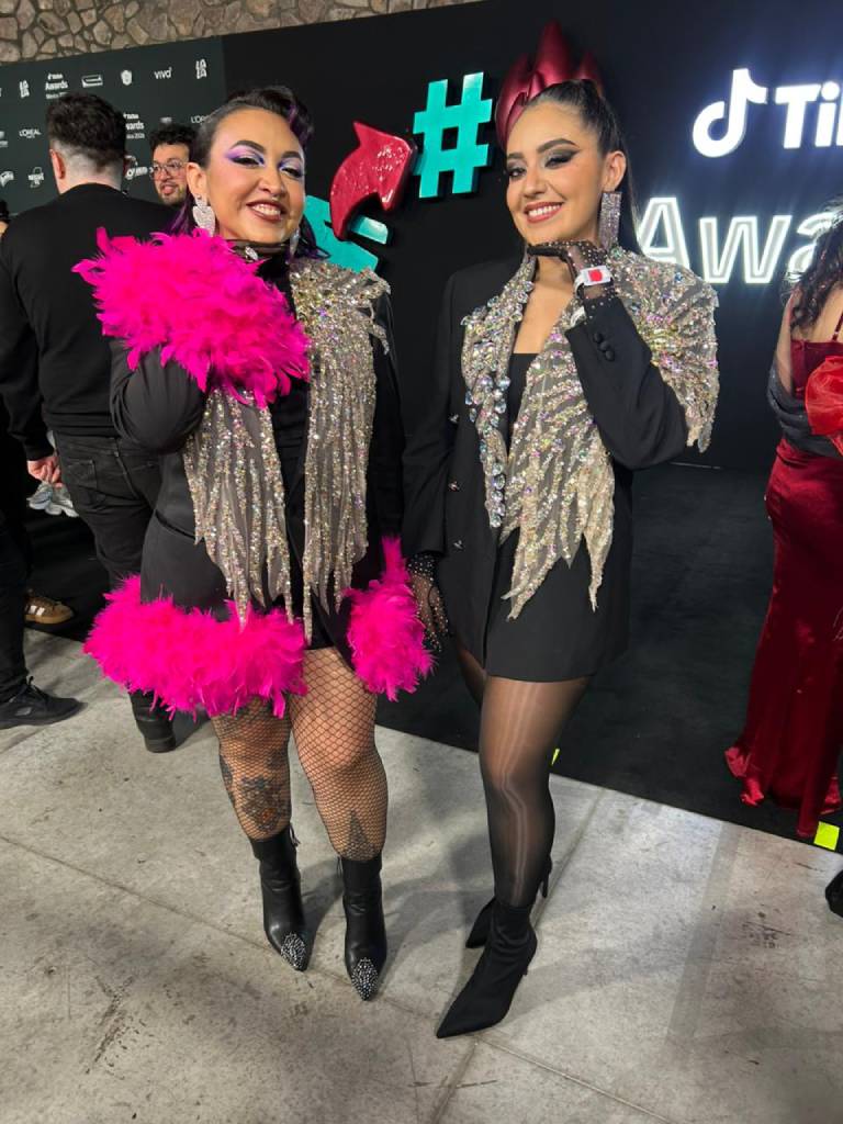 De las primeras creadoras de contenido en desfilar en la alfombra roja fueron “Las Damitas Histeria”, que portaron una vestimenta con mallas y botas oscuras, acompañada de una chalina con toques dorados y unos aretes brillantes que deslumbraron en la gala.
