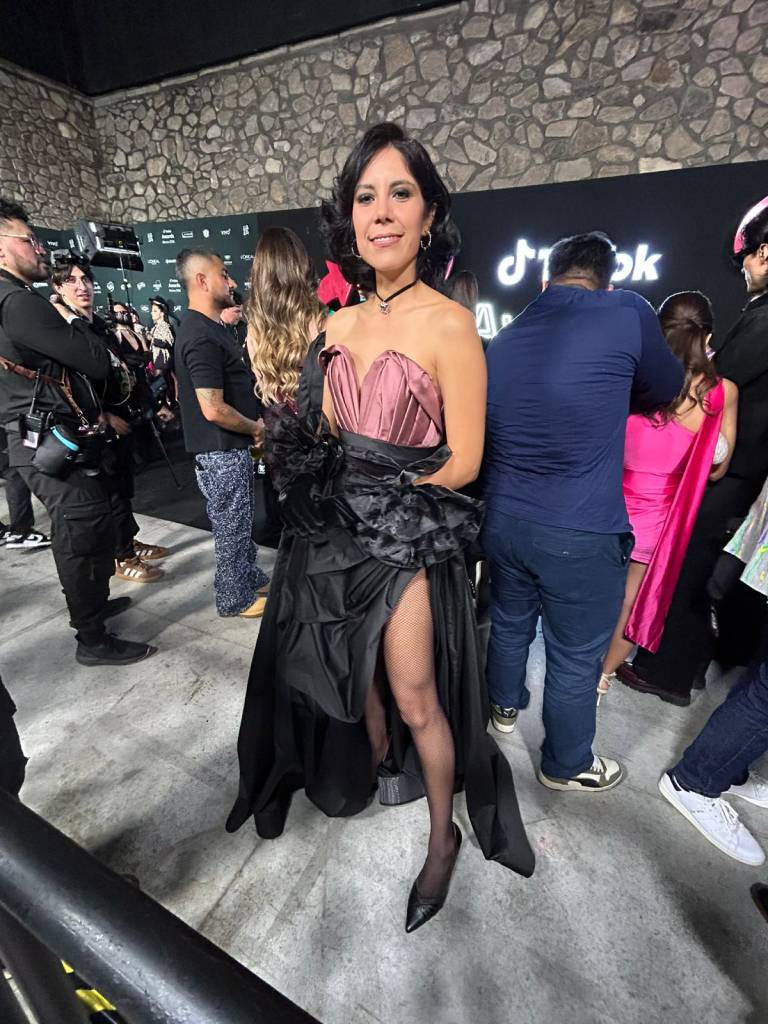 Gaby Meza, especialista en cine, sorprendió en la alfombra roja con un vestido en dos tonos, una parte con rosa pálido metálico y otra con color negro, un gran moño en la cintura, guantes negros y un gran escote.