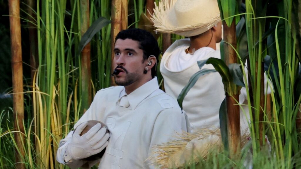 El artista originario de Puerto Rico inició su presentación con “Titi me pregunto” en medio de un campo de cañas, un sembradío que durante siglos marcó la economía y la sociedad colonial del país, sostenida por la esclavitud hasta el siglo XIX, de acuerdo con la Enciclopedia PR.
