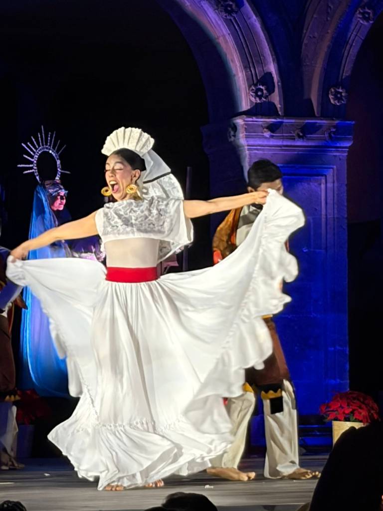 El montaje reúne a más de 100 bailarines y músicos en escena, quienes portan el vestuario original diseñado por Amalia Hernández, y se presenta año con año en la explanada del castillo para conmemorar las fiestas navideñas en familia.