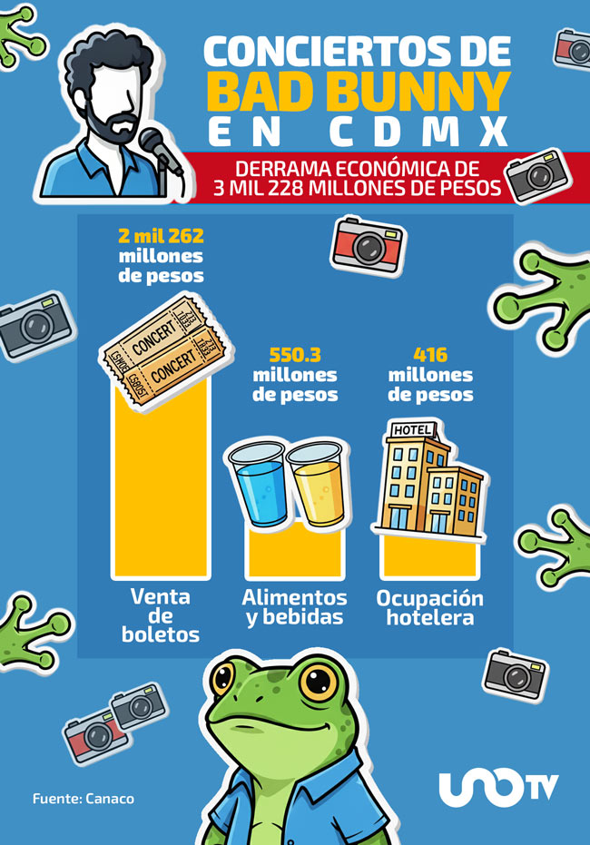 Se espera dicha derrama económica del 10 al 21 de diciembre, fechas en las que el intérprete de “Me porto bonito” tendrá sus ocho conciertos (10, 11, 12, 15, 16, 19, 20 y 21) y se espera una afluencia total de entre 500 mil y 520 mil asistentes tanto nacionales como extranjeros, según Canaco.