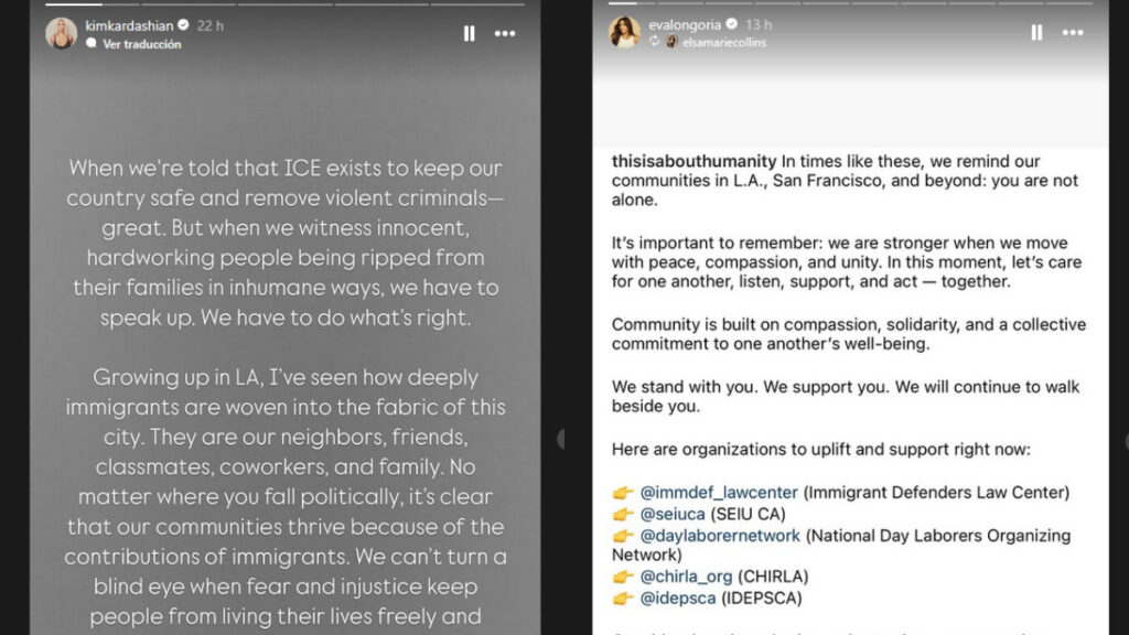 Famosos como Kim Kardashian, Mark Ruffalo y Eva Longoria se manifestaron públicamente para rechazar las acciones del ICE y respaldar a los migrantes. Desde publicaciones hasta discursos en vivo, usaron su influencia para visibilizar el miedo y dolor que enfrentan miles de personas sin papeles en Estados Unidos.