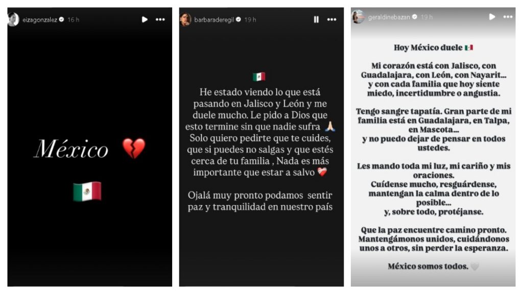 En el caso de la también actriz Geraldine Bazán, la preocupación fue aún más personal, ya que parte de su familia reside en zonas impactadas. La actriz envió palabras de apoyo a Jalisco, Guadalajara, León y Nayarit, y pidió a la población mantenerse a salvo y actuar con calma.