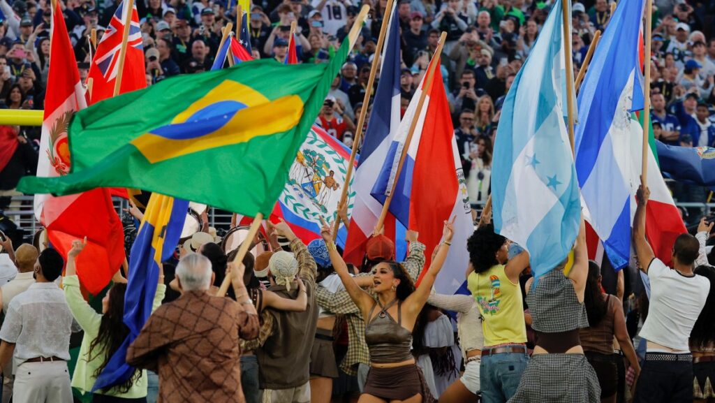 En punto de las 19:15 horas, Bad Bunny tomó el control de la conversación deportiva al posicionarse enfrente del escenario inspirado en varios aspectos de la cultura migrante.