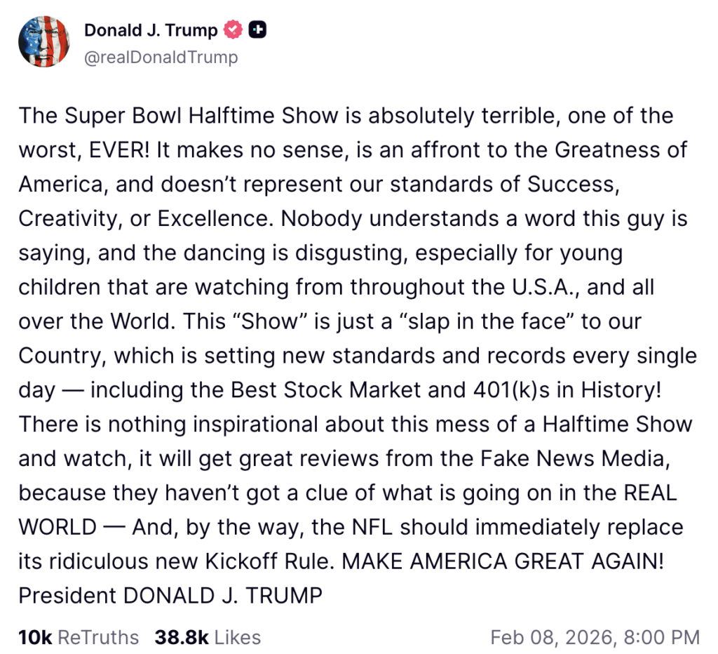 “¡El espectáculo del medio tiempo del Super Bowl es absolutamente terrible, uno de los peores de la historia! No tiene sentido, es una afrenta a la grandeza de Estados Unidos y no representa nuestros estándares de éxito, creatividad ni excelencia”.
