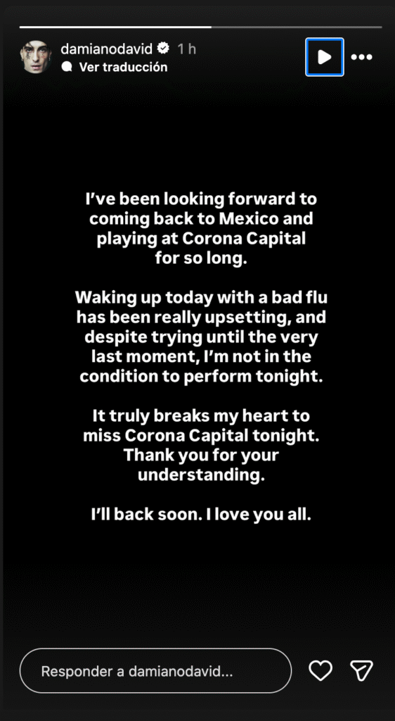 A través de sus stories de Instagram, Damiano David informó que amaneció este sábado con una “fuerte gripe”, por lo que tuvo que cancelar su concierto en el Corona Capital.