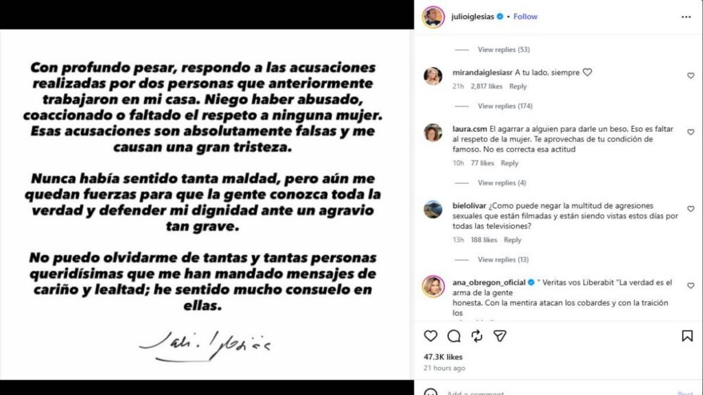 En su mensaje, Julio Iglesias aseguró que nunca ha abusado ni faltado al respeto a ninguna mujer.