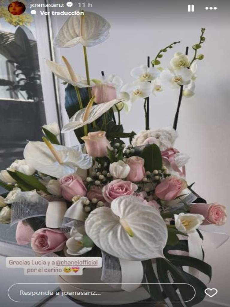 El nacimiento fue celebrado por Joana Sanz en sus redes sociales, donde compartió una imagen de un arreglo floral que les fue regalado, con la leyenda: