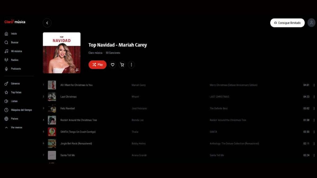 Una lista de canciones navideñas en Claro Música es fácil de escuchar en cualquier parte, y puede incluir a famosos como Belinda, Luis Miguel, Thalía, Ariana Grande, Frank Sinatra, Celine Dion, Taylor Swift, Camila Cabello, The Carpenters, Justin Bieber y Juan Gabriel, entre otros más.