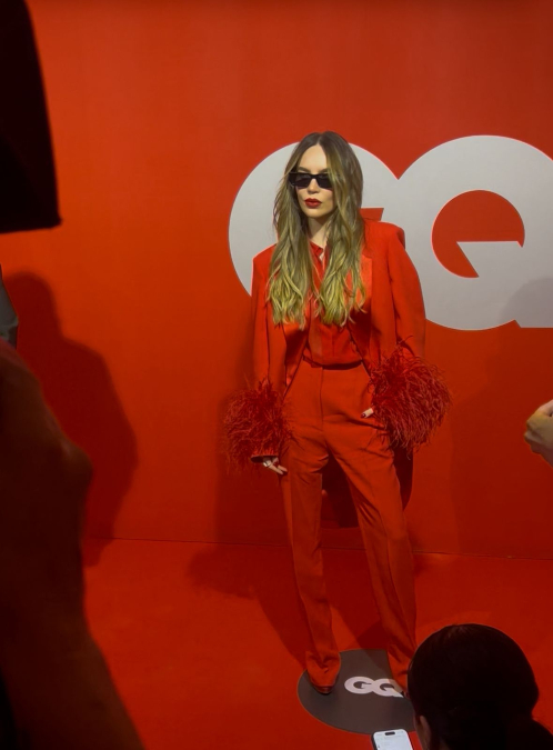 Belinda se impuso con un atuendo totalmente en rojo, desde saco, camisa, pantalón y zapatillas, combinado su piel y cabellera clara: