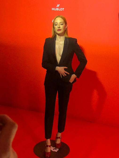 La actriz Cecilia de la Cueva deslumbró a la prensa con un traje oscuro, sin camisa y de saco abierto, junto con unas zapatillas rojas con correo en el tobillo: