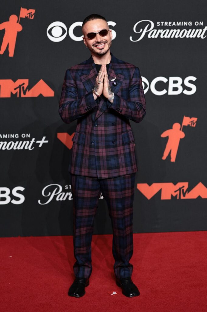 J Balvin siguió la tendencia de los conjuntos a cuadros, aunque el colombiano no lo usó abierto y, contrario a Lenny Kravitz, sí usó una prenda debajo del blazer.