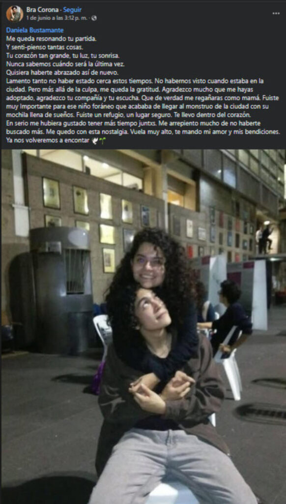 Braulio Corona, miembro de la Escuela Nacional de Arte Teatral (ENAT) que coincidió con Daniela Bustamante, se despidió de la creadora escénica a través de su cuenta de Facebook con un desgarrador mensaje.