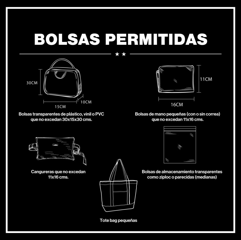 Con el objetivo de evitar que no dejen pasar a los fans, o que se vean en la necesidad de dejar su mochila en una paquetería externa, se recomienda evitar las siguientes bolsas: