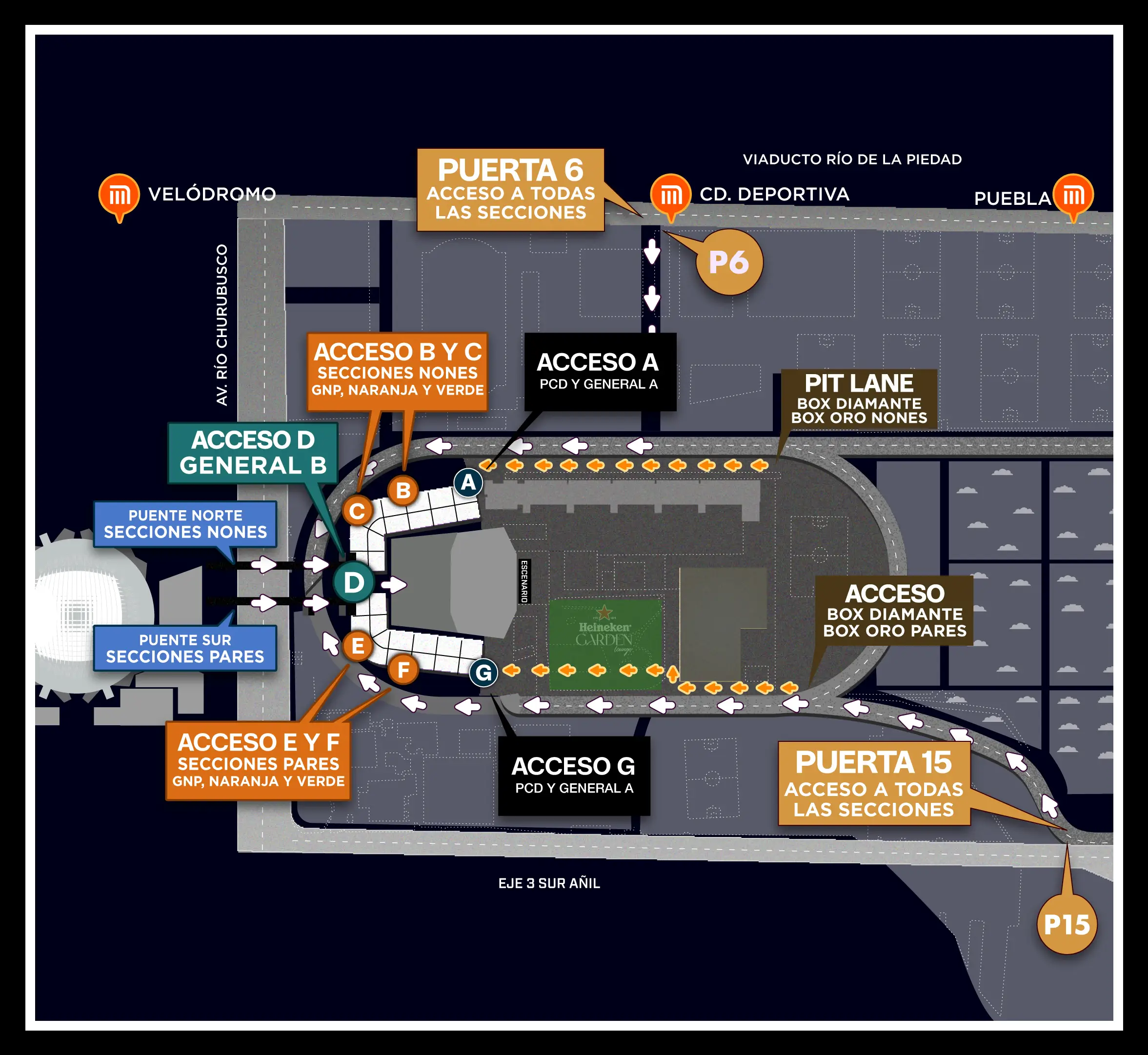 Cabe destacar que el Metro Cd. Deportiva es la más cercana a la Puerta 6 del Autódromo Hermanos Rodríguez, la cual da acceso a todas las secciones, estas son: