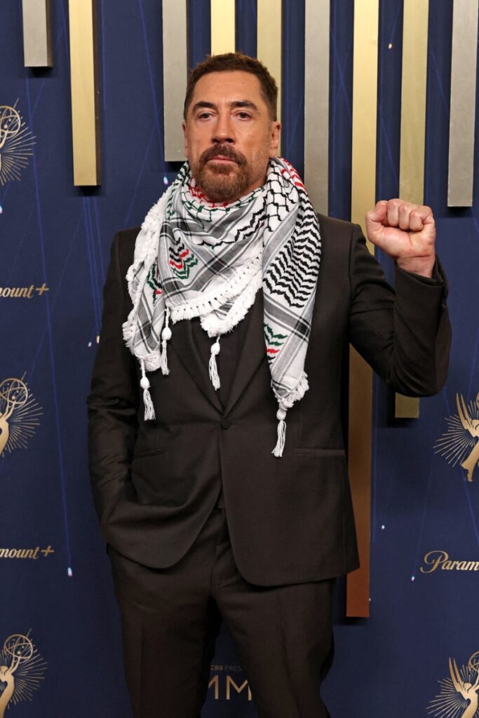 Por su parte, el actor español Javier Bardem destacó en la alfombra roja de los Premios Emmy 2025, pues llevaba una kufiya en apoyo a los palestinos.