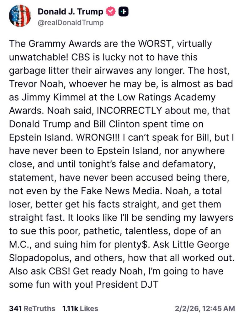 “Noah ha dicho INCORRECTAMENTE que Donald Trump y Bill Clinton pasaron tiempo en la isla de Epstein. ¡FALSO! No puedo hablar por Bill, pero yo nunca he estado allí, ni cerca, y hasta estas falsas y difamatorias declaraciones, nunca había sido acusado de estar allí, ni siquiera en los medios de noticias falsas”.
