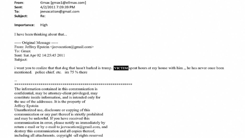 Uno de los mensajes, fechado en abril de 2011, fue enviado por Epstein a Ghislaine Maxwell, su colaboradora, en el que menciona que Trump “pasó mucho tiempo” con una mujer identificada posteriormente como Virginia Giuffre, principal acusadora del financista.