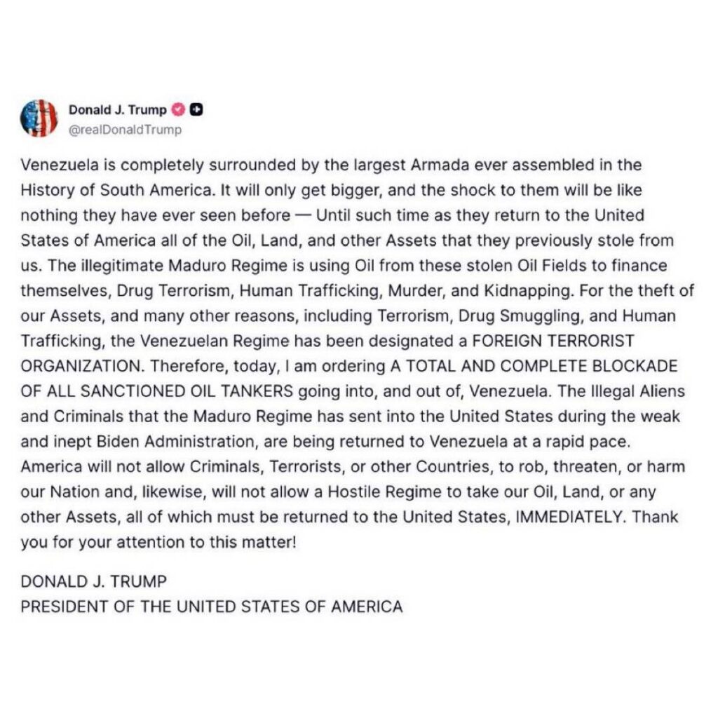 Donald Trump afirmó que ordenó un bloqueo total y completo a todos los petroleros sancionados que entren o salgan de Venezuela, como medida contra el gobierno de Nicolás Maduro. El mensaje fue difundido este martes en su red social, Truth Social, y está firmado con su nombre y el cargo de Presidente de los Estados Unidos de América.