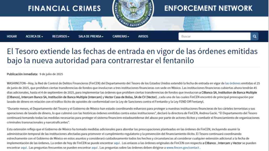 El Departamento del Tesoro de Estados Unidos anunció este miércoles 9 de julio que extiende 45 días más el plazo para que entren en vigor las sanciones contra CIBanco, Intercam y Vector Casa de Bolsa, todas con sede en México. Las medidas ahora se aplicarán a partir del 4 de septiembre de 2025.