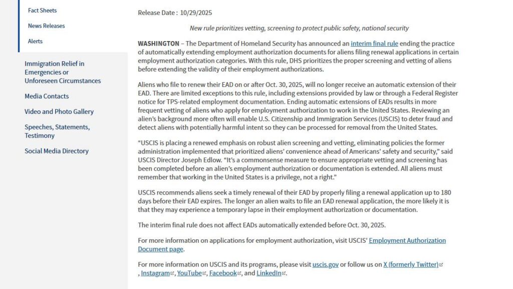 El Departamento de Seguridad Nacional (DHS) de Estados Unidos anunció un cambio clave en las reglas laborales para migrantes: a partir del 30 de octubre, ya no habrá extensión automática de permisos de trabajo.