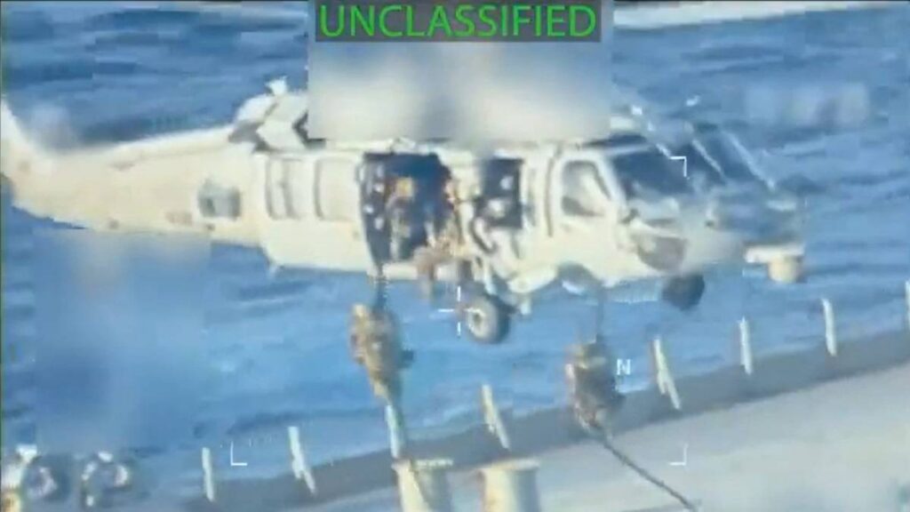 La fiscal general estadounidense, Pam Bondi, compartió el video del momento en el que personal estadounidense se apodera del buque: un grupo de militares desciende de helicópteros y aborda el navío en alta mar.