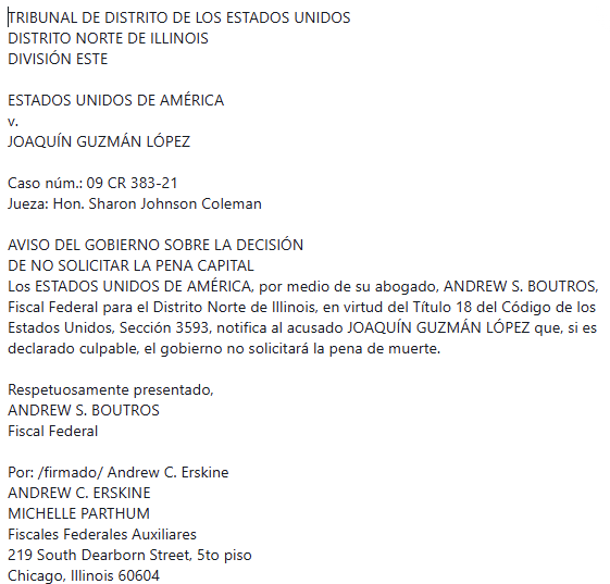 El Gobierno de Estados Unidos descartó solicitar la pena de muerte contra Joaquín Guzmán López, hijo de Joaquín “Chapo” Guzmán, en caso de que sea declarado culpable de los delitos de narcotráfico que se le imputan. Así lo confirma un documento judicial presentado en una corte de Chicago, firmado por el fiscal Andrew S. Boutros.