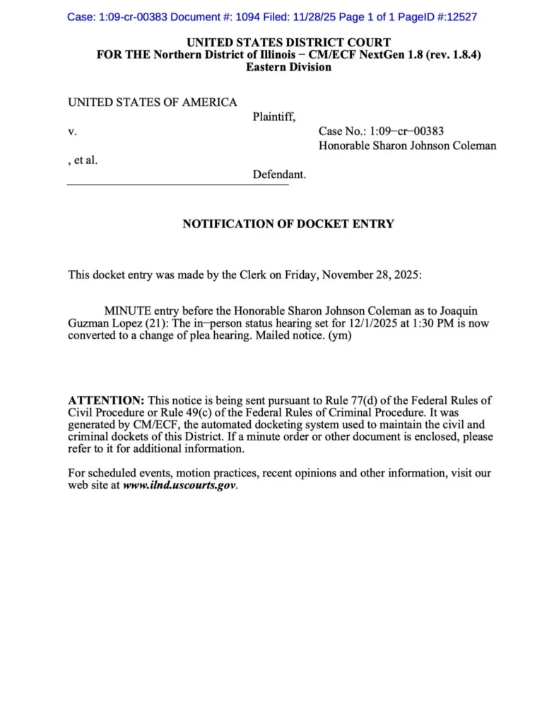 Joaquín Guzmán López, hijo de El Chapo, se declarará culpable en un tribunal del distrito de Illinois el 1 de diciembre, según una notificación difundida este viernes. El documento, dirigido a la jueza Sharon Johnson Coleman, confirma que la audiencia programada para esa fecha se convertirá en una sesión de cambio de declaración. El proceso representa un nuevo capítulo en la situación jurídica del hijo del histórico líder del Cártel de Sinaloa, quien ya había sido señalado como un operador relevante dentro de la estructura criminal.