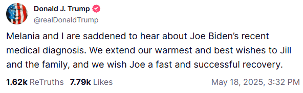 “Melania y yo estamos entristecidos por conocer el reciente diagnóstico médico de Joe Biden. Enviamos nuestros más cálidos y mejores deseos a Jill y a la familia, y le deseamos a Joe una rápida y exitosa recuperación”.