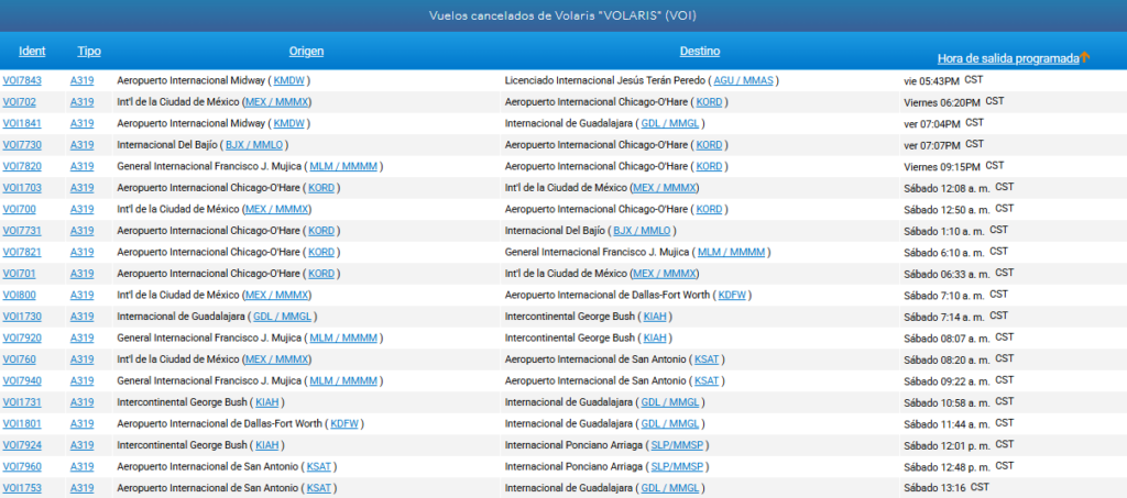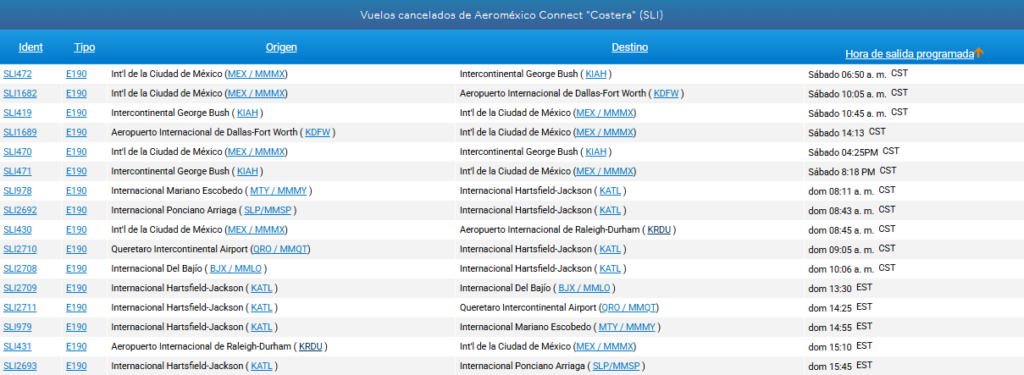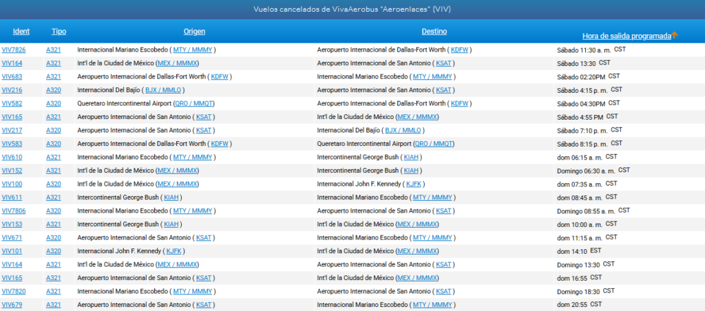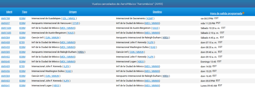En la plataforma FlightAware se observa que múltiples vuelos de las aerolíneas Aeroméxico, Aeroméxico Connect, Viva Aerobus y Volaris han sido cancelados este fin de semana.