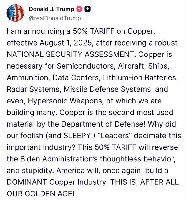 Aseguró que el nuevo arancel servirá para reconstruir una industria dominante del cobre y llevar a EE. UU. a una “nueva edad dorada”, en sus propias palabras.