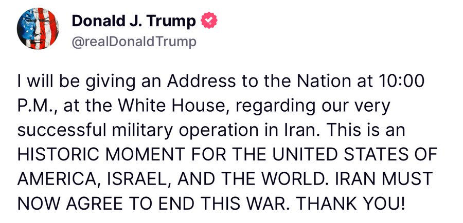 “Daré un discurso a la nación a las 22:00 h en la Casa Blanca, en relación con nuestra exitosa operación militar en Irán. Este es un momento histórico para Estados Unidos, Israel y el mundo. Irán debe ahora aceptar poner fin a esta guerra. ¡Gracias!“.