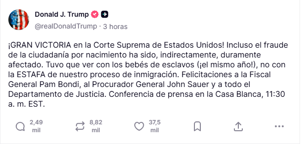 La Corte Suprema de EE. UU. aprobó este viernes 27 de junio una orden que permitirá al presidente Donald Trump aplicar restricciones a la ciudadanía por nacimiento en 28 estados, al validar temporalmente una orden ejecutiva firmada en enero, durante su segundo mandato.
