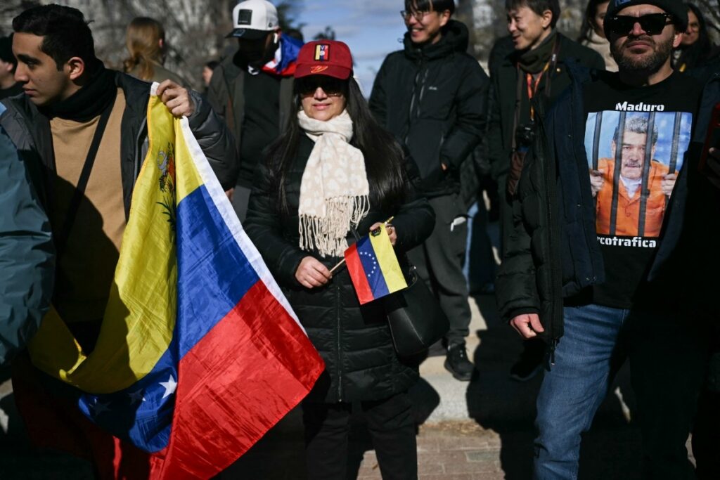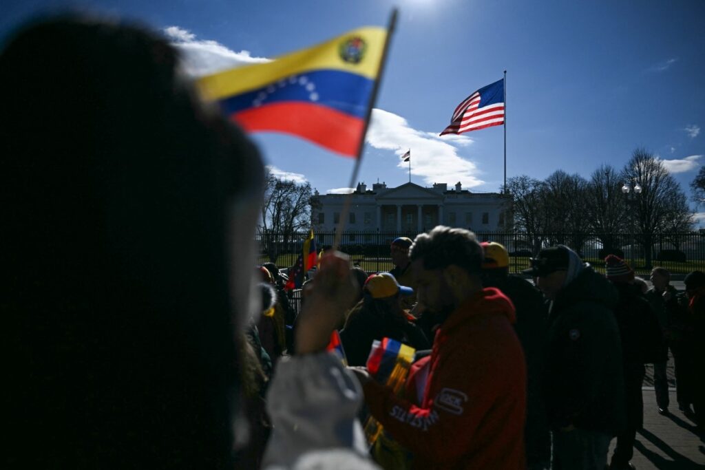 Un grupo numeroso de venezolanos se dio cita a las afueras de la Casa Blanca previo al encuentro entre el presidente Trump y Corina Machado. Los asistentes portaron banderas de Venezuela y pancartas con mensajes alusivos a la situación política de su país.