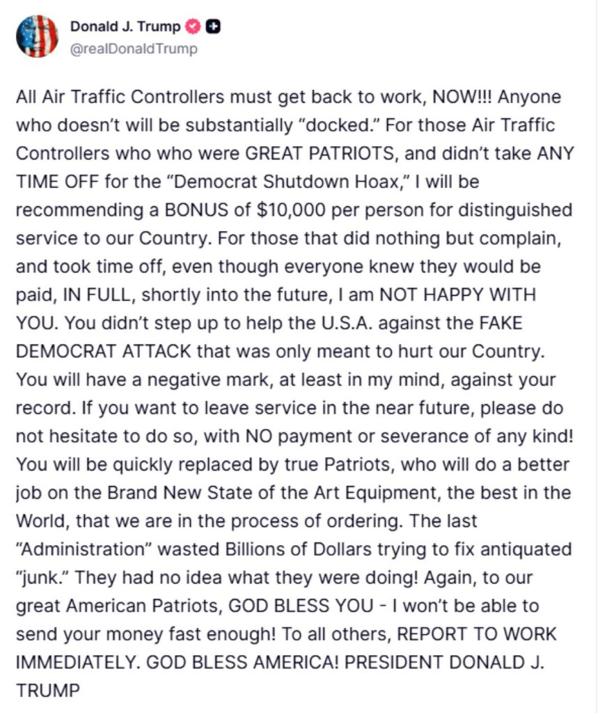“¡Todos los controladores aéreos deben volver al trabajo, ahora mismo!”, escribió en redes sociales, advirtiendo que quienes no obedezcan podrían enfrentar una reducción de sueldo significativa.