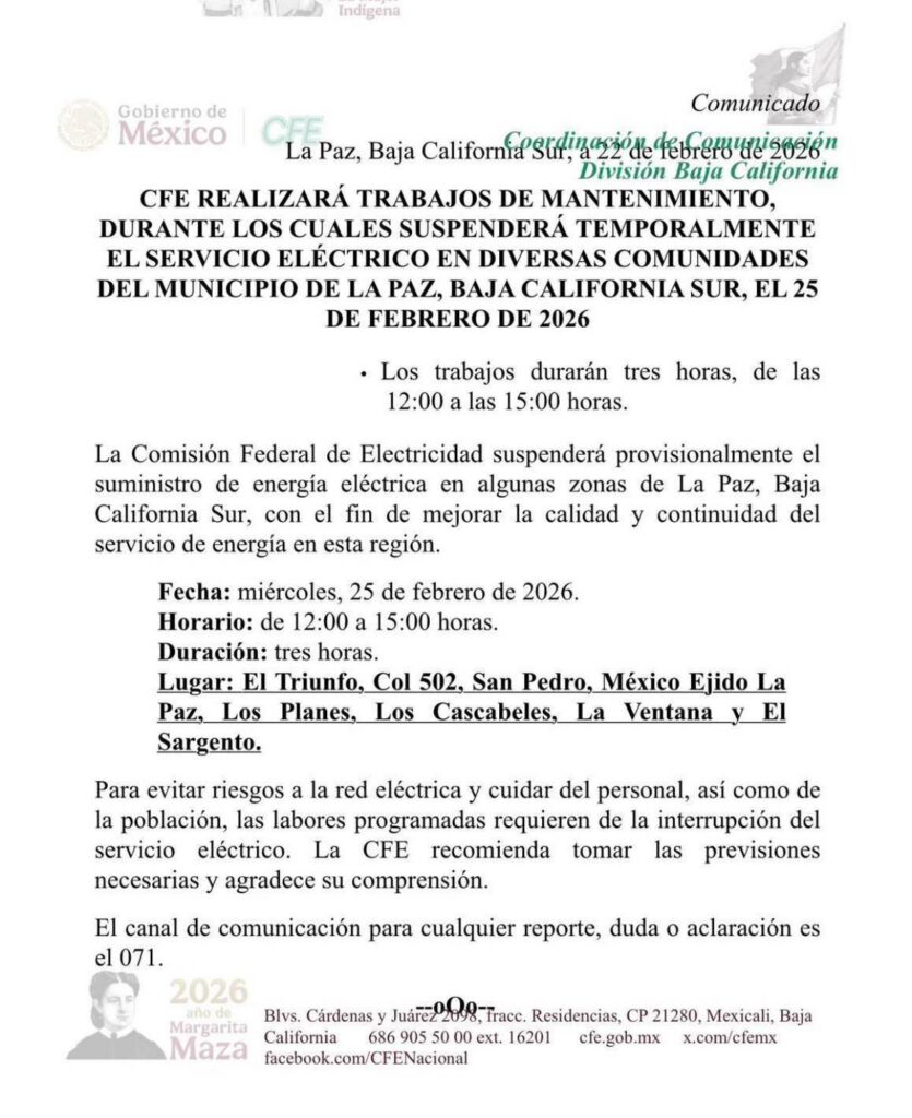 La Comisión Federal de Electricidad (CFE) dio a conocer que suspenderá el servicio de luz eléctrica este próximo miércoles 25 de febrero de 2026 en algunas colonias de La Paz, en el estado de Baja California Sur.