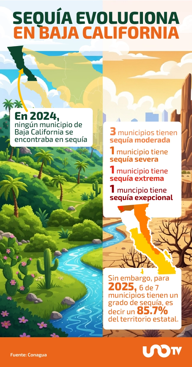 La sequía, este año, ha afectado a varios estados de México, entre ellos Baja California, que en 12 meses pasó de no tener ningún municipio en condición de sequía a registrar un 85.7% de su territorio con algún grado de afectación, de acuerdo con el más reciente informe de la Comisión Nacional del Agua (Conagua) con corte al 31 de julio de 2025.