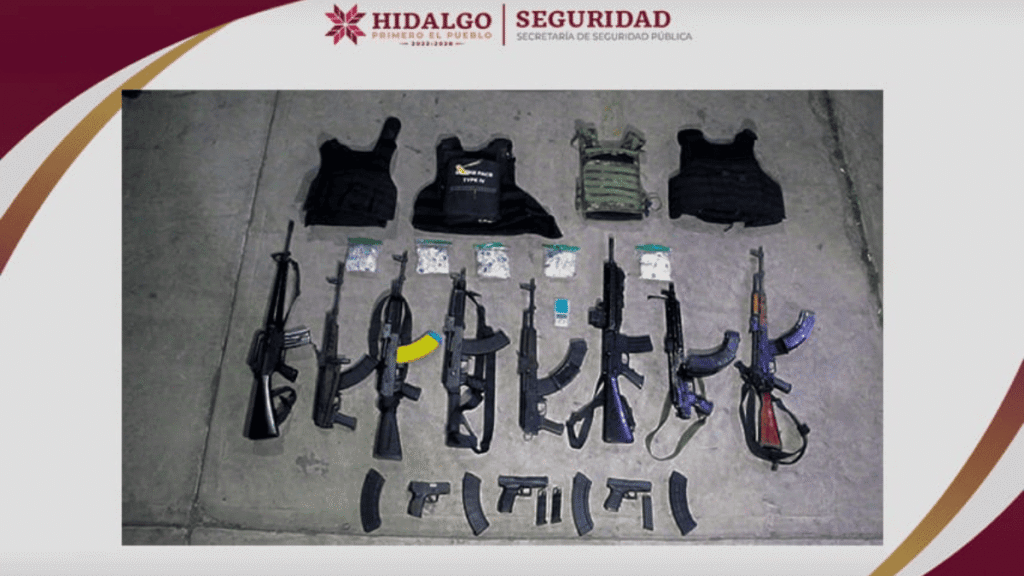 Asimismo, fueron decomisados cuatro chalecos balísticos con placas, trece equipos celulares, seis vehículos, y una motocicleta. Todo el material asegurado, incluyendo las personas, armas, vehículos, sustancias ilícitas y demás objetos, fueron puestos a disposición de la Procuraduría General de Justicia del Estado de Hidalgo para la integración de las carpetas de investigación correspondientes.