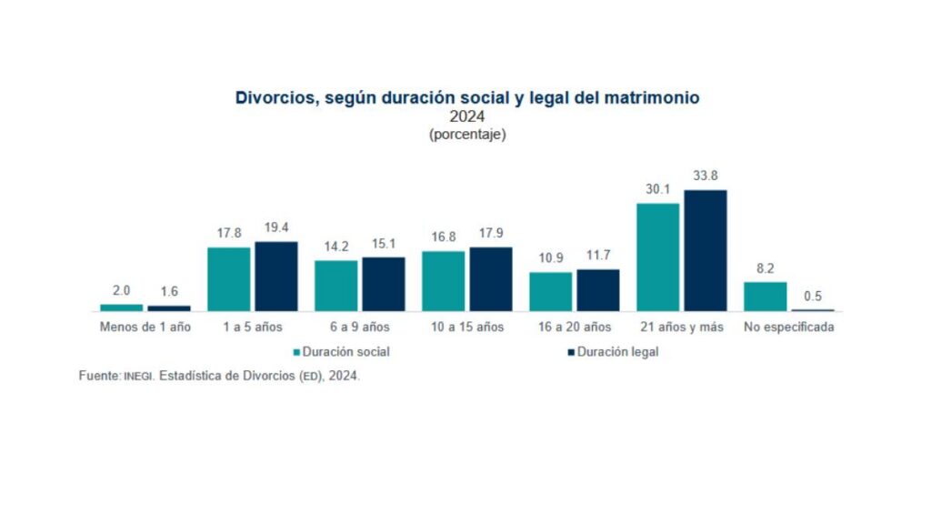 Esto muestra que una parte importante de los divorcios ocurre tras largos periodos de matrimonio.