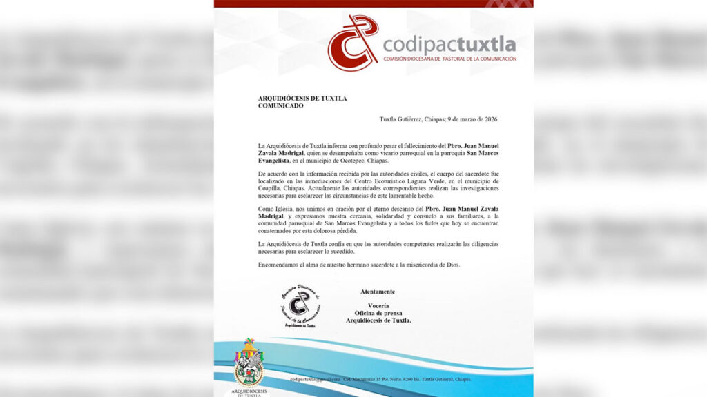 La Arquidiócesis de Tuxtla confirmó este lunes la muerte del sacerdote Juan Manuel Zavala, párroco de la iglesia de San Marcos Evangelista, en Ocotepec, Chiapas, luego de ser reportado como desaparecido la noche del domingo. El caso ya es investigado por autoridades estatales.