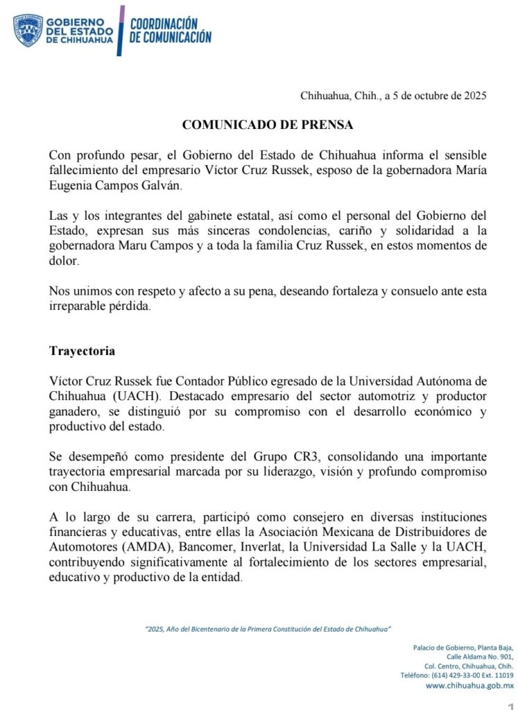 “Las y los integrantes del gabinete estatal, así como el personal del Gobierno del Estado, expresan sus más sinceras condolencias, cariño y solidaridad a la gobernadora Maru Campos y a toda la familia Cruz Russek, en estos momentos de dolor”, se lee en el comunicado.